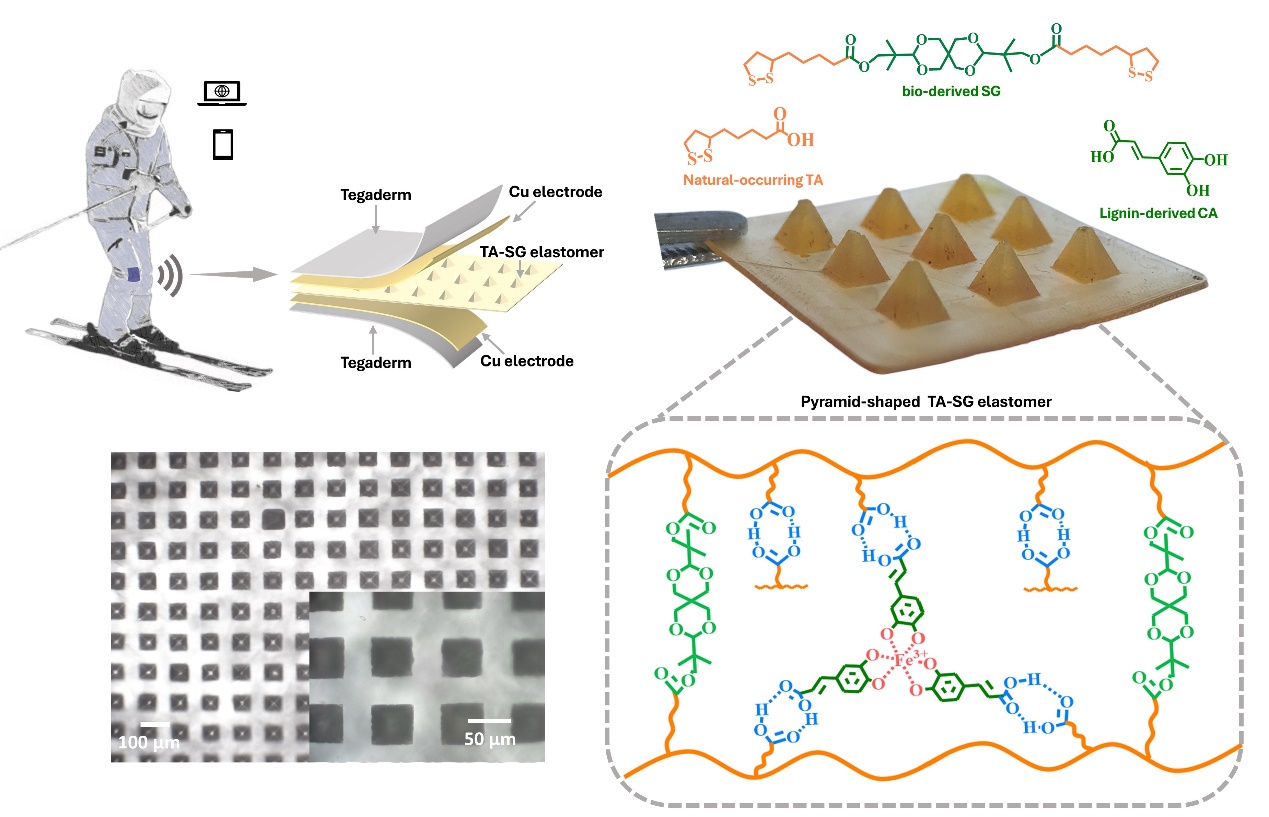 近期,该研究团队报道了一种具有本征自愈能力和闭环回收性的新型介电层弹性体。该弹性体源于生物基螺二醇衍生二硫动态共价适应性网络(CANs),并辅以木质素合成中间体咖啡酸及金属铁离子为掺杂交联剂,所构筑的可回收动态聚合网络因合理的刚性螺二醇/柔性二硫组分比而具备了良好的机械柔韧性和热稳定性,也因其丰富的氢键和金属-儿茶酚配位键而使其具备常温自修复能力。所组装的电容压力传感器灵敏度高达9.26 kPa-1,响应时间与恢复时间分别为32ms和24 ms。该传感器适用于实时人体运动监测,且在损伤自愈合或闭环回收后,依旧持续输出稳定的检测信号。这将有助于推动电容传感器研究向动态智能、高性能和可持续的方向发展。