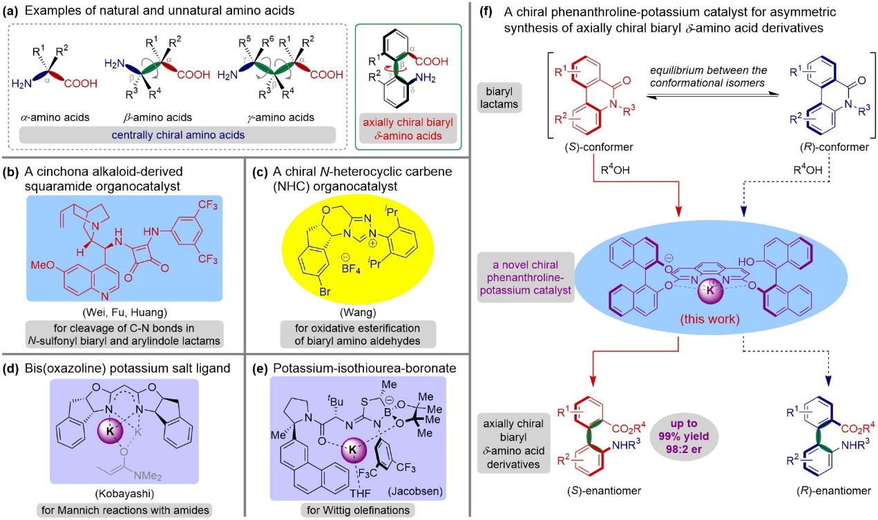 近日,我校化学与分子工程学院费林加诺贝尔奖科学家联合研究中心张志鹏教授团队在新型原创性手性催化剂的设计发展和应用研究方面取得新进展,相关工作以Catalytic Asymmetric Synthesis of Unnatural Axially Chiral Biaryl δ‐Amino Acid Derivatives via a Chiral Phenanthroline‐Potassium Catalyst‐Enabled Dynamic Kinetic Resolution”为题发表于Angewandte Chemie International Edition。
