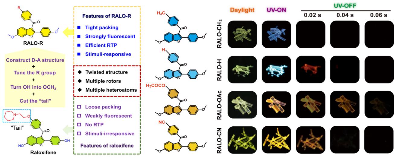 近期,该研究团队基于第二代选择性雌激素受体调节剂——雷洛昔芬的分子结构,遵循合理的分子设计策略,开发了一类具有多重刺激响应性的单组分纯有机室温磷光小分子(图1)。这些雷洛昔芬类似物具有结构简单、原料易得、易于制备以及性能优越等特点。结合单晶结构解析和理论计算,研究团队证明了晶体结构中分子紧密的反平行堆积是影响其室温磷光性能的关键,当取代基为吸电子基时更有利于化合物形成紧密堆积,从而实现更高量子产率和更长的磷光寿命。