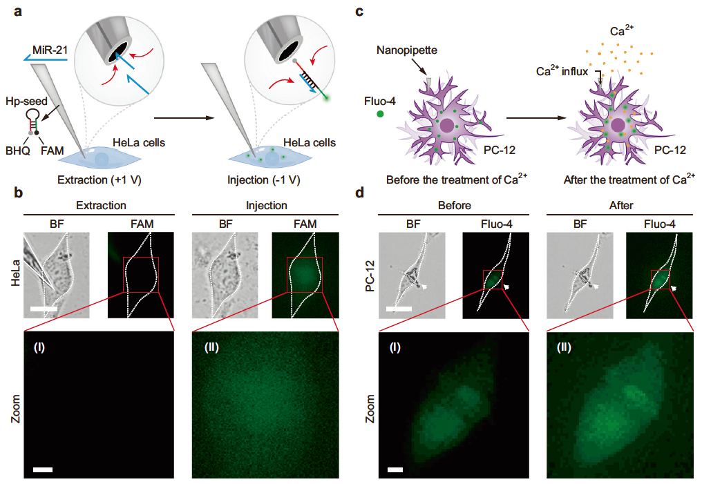 此外,利用建立的人工跨膜通道还可以实现单个活细胞水平的基因沉默和Ca2+选择性跨膜转运,相关跨膜传递动态过程可通过超微电化学/荧光成像进行实时监测,为细胞跨膜传递动态监测体系的设计提供了一种新的解决思路。