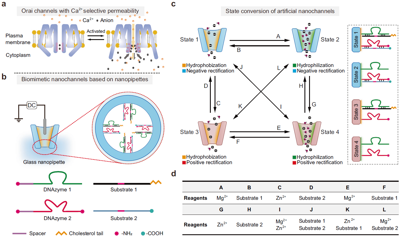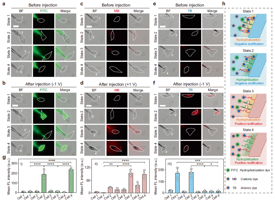 此前发展的跨膜传递方法大多侧重于治疗,如基于脂质体囊泡、纳米颗粒的药物递送,在跨膜过程的精细调控与动态监测方面有很大局限性。因此,本工作设计了一种基于超微玻璃电极的人工纳米通道,将金属离子特异性激活 DNAzyme修饰在玻璃电极内壁,构建了一种内壁物化性质可调的人工仿生跨膜通道,并通过电流-电压曲线对跨膜传递进行实时动态监测。通过金属离子和DNAzyme末端基团调节人工纳米通道内壁表面的润湿性和电荷,结合超微电化学信号实时监测以及荧光显微成像,成功实现了人工跨膜通道在不同渗透状态之间的可逆转换与实时动态监测。人工跨膜通道具有四种不同的渗透状态(状态1: 疏水、负电; 状态2: 亲水、负电; 状态3: 疏水、正电; 状态 4: 亲水、正电),对于具有不同亲疏水性、不同电荷的功能分子,其在不同渗透状态下的跨膜传递效率具有明显区别。将人工跨膜通道嵌入单个活细胞膜,通过改变通道的渗透状态,可以实现不同染料分子的选择性跨膜递送,并通过电化学信号和荧光成像进行实时动态分析。