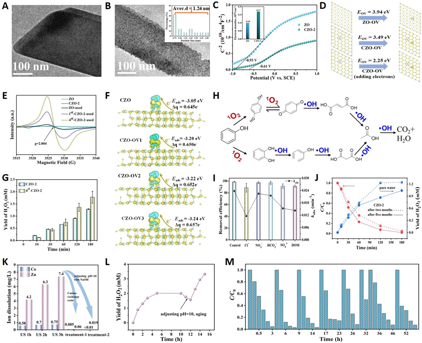 近年来,压电催化作为一种极具潜力的新兴环境催化技术,在原位产H2O2及降解有机污染物、杀菌等污染物控制领域引起了人们广泛的关注。但是,传统压电催化产H2O2体系往往需要加入有机空穴牺牲试剂(潜在二次污染)且反应条件苛刻。近日,邢明阳教授团队开发了一种利用动态氧缺陷来促进ZnO原位产H2O2的环境友好型压电催化体系,并用于水中有机污染物的长效降解。采用一步水热结合光沉积的方法制备了Co纳米簇负载ZnO棒状压电催化剂(CZO,图A,B)。实验结合DFT计算证实,Co在超声过程中不仅能作为吸电子中心促进电子与空穴的分离(图C),还能促进ZnO表面氧缺陷的生成。随着超声时间的延长,氧缺陷的形成能显著降低且氧缺陷的EPR信号峰显著增强(图D,E),这说明CZO在超声过程中形成了表面动态氧缺陷。随着氧缺陷浓度的升高,CZO对O2的吸附能降低(图F),从而促进压电电子通过双电子反应历程活化O2原位产H2O2。实验结果表明,在不加入任何有机牺牲剂的条件下,超声3小时最高可生成1.8 mM H2O2(图G)以及对苯酚50.9%的矿化率,分别是空白ZnO的10.5倍和13倍。此外,实验证实1O2是羟基化苯酚等有机物的主要活性物种,而•OH则是开环矿化有机污染物的主要活性物种(图H)。CZO压电体系具有优异的抵抗pH值、阴离子、天然有机质等环境基质干扰的能力(图I),即使在环境中暴露5个月之久,CZO依然保持优异的原位产H2O2及降解苯酚的性能(图J)。而溶出的钴和锌离子只需经过简单的加碱陈化处理,即可实现金属离子回收及产H2O2能力的再生(图K,L)。环境友好型可再生CZO压电体系可实现对有机污染物52小时以上的长效降解(图M),在水污染控制领域具有潜在的应用前景。