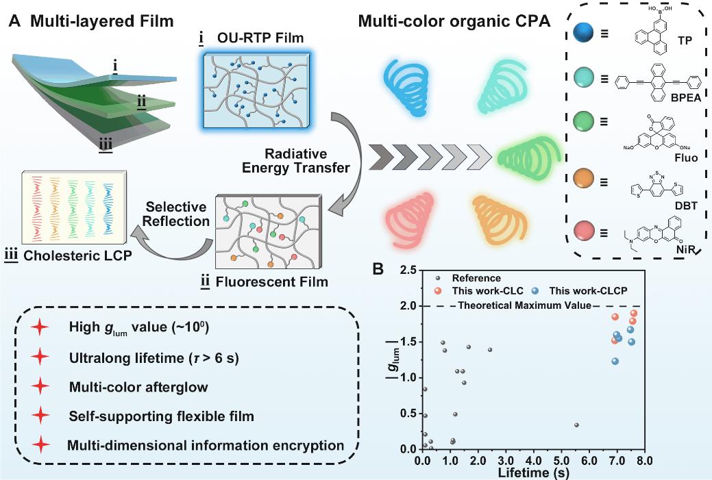 纯有机圆偏振余辉材料因其随时间变化的余辉和偏振特性而具有多维光学特性,可以在较长的时间内提供稳定的偏振光信号。这种集成进一步拓展了光信号的维度,增强了存储信息的稳定性和可靠性,并推动了高灵敏度和高选择性的光学传感器的发展,在信息存储和防伪领域具有独特的吸引力和价值。圆偏振余辉材料两个重要参数是不对称因子(glum)和寿命。近年来,尽管研究者们已提出了多种提高圆偏振余辉材料glum值的方法,如晶体工程、共聚、掺杂和手性超分子组装等,但要获得兼具超长寿命和高glum值的有机圆偏振余辉材料仍颇具挑战。