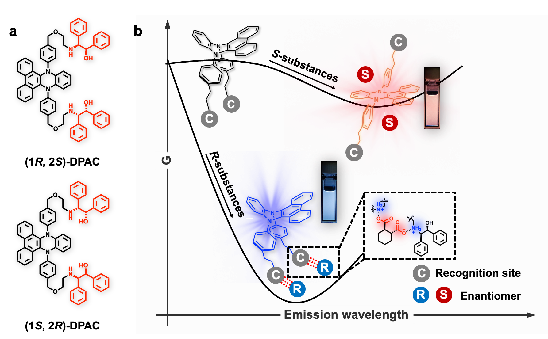 手性是自然界赋予分子的“镜像”属性,也是药物、农药、食品添加剂能否发挥预期作用、避免毒副作用的重要因素之一,因此精确识别对映体并开发相应分析技术尤为重要。基于发光的检测技术具有简便、快速以及实时监测等优点,其核心挑战在于利用染料与对映异构体之间的差异性相互作用,精确调节其发射能级,实现对映体的高灵敏度区分。近日,我校化学与分子工程学院田禾院士、马骧教授团队在功能染料手性识别领域取得重要进展,相关研究成果发表于《自然·通讯》Nature Commun. 2025, 16, 7788